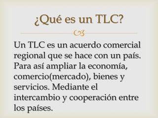 Un TLC es un acuerdo comercial regional entre países para ampliar el comercio, bienes y servicios mediante el intercambio cooperativo. Colombia ha firmado TLCs con la Comunidad Andina, el Grupo de los Tres, EE.UU., Mercosur y Chile para desarrollar su economía y comercio exterior. Los TLC deben cumplir con los derechos comerciales internacionales y promover la cooperación entre los países firmantes.