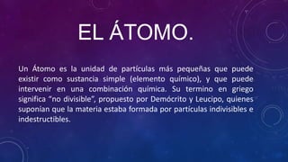 El documento describe la estructura del átomo, incluyendo que está compuesto de un núcleo central con protones y neutrones, y electrones en una corteza exterior. Explica que los átomos se diferencian por la cantidad y distribución de estas partículas subatómicas. También menciona el modelo de Bohr en el que los electrones orbitan alrededor del núcleo atómico.