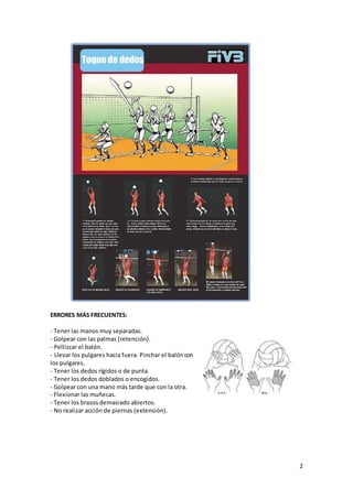 El documento aborda las técnicas del toque de dedos en voleibol, detallando su importancia y características según las reglas del deporte. Explica los errores comunes al realizar este golpe, así como diferentes tipos de pases: hacia adelante, de espaldas y laterales. Además, presenta una serie de ejercicios para mejorar la técnica y coordinación entre jugadores.