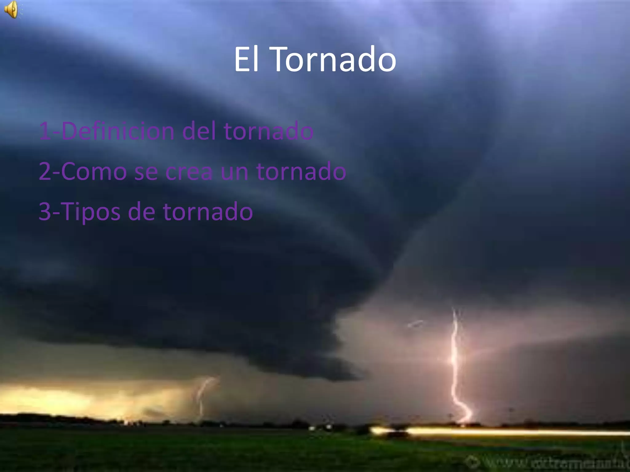 El documento describe el tornado, explicando que es una columna de aire que gira violentamente y conecta la superficie terrestre con una nube de tormenta. Los tornados se forman a partir de severas tormentas eléctricas que generan embudos de aire giratorio. Existen diferentes tipos de tornados clasificados por su velocidad e intensidad de daños, desde los débiles F0 y F1 hasta los más violentos y devastadores F4 y F5.