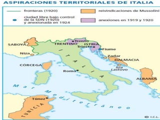 El documento describe el totalitarismo y el fascismo italiano. Resume que en un régimen totalitario, el Estado controla todos los aspectos de la sociedad y la política, la libertad es reprimida, existe un partido único y un líder carismático es el centro del poder. Luego describe cómo el fascismo italiano surgió después de la Primera Guerra Mundial en medio de la inestabilidad política y social en Italia, con Benito Mussolini estableciendo una dictadura fascista en 1922.