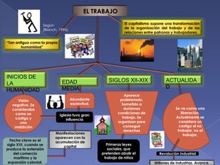 Este documento resume la historia del trabajo a lo largo de la historia humana. Comienza viéndose como un castigo en la antigüedad y la edad media, luego se convierte en una necesidad para la subsistencia bajo duras condiciones en la revolución industrial, y actualmente se considera una liberación y castigo el no trabajar.