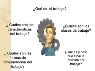 El documento define el trabajo como una actividad humana y consciente que implica esfuerzo y se realiza para obtener bienes y servicios que satisfagan necesidades. Explica que el trabajo tiene características como ser obligatorio, causar fatiga e implicar peligro. Se dividen los tipos de trabajo en intelectual, manual, directivo y ejecutivo; y la condición laboral en dependiente e independiente. También habla sobre la división del trabajo, las formas de remuneración como salario y jornal, y estructura de la población económic
