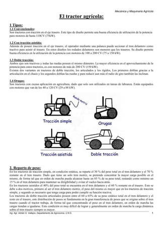 Este documento describe los diferentes tipos de tractores agrícolas, incluyendo tractores convencionales, con tracción asistida y doble tracción. También discute el reparto de peso, lastre, ruedas y neumáticos agrícolas. Explica los componentes clave del tractor como la toma de potencia, barra de tiro y enganche de tres puntos.