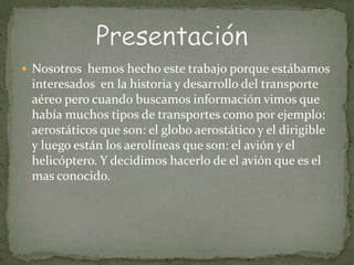 Este documento describe brevemente la historia y tipos de aviones. Comienza explicando los orígenes del transporte aéreo y los primeros aviones con motor como el de los hermanos Wright. Luego detalla algunos tipos de aviones militares, de rescate y comerciales. Finalmente menciona algunos accidentes aéreos importantes y brevemente las partes y funcionamiento básico de los aviones.