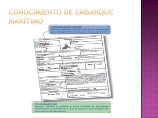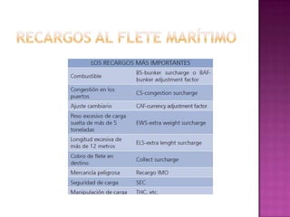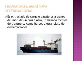 1. El transporte marítimo es el traslado de carga o pasajeros entre países a través del mar utilizando embarcaciones como barcos.