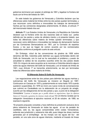 1) El documento describe los orígenes del problema fronterizo de Venezuela con Colombia y Guyana, incluyendo tratados históricos como el Tratado Michelena-Pombo de 1833 y el Laudo Arbitral de 1899 que despojaron a Venezuela de territorio. 2) También resume las negociaciones más recientes entre Venezuela y Colombia sobre la delimitación del Golfo de Venezuela, que han reavivado la disputa fronteriza. 3) Por último, resume el Acuerdo de Ginebra de 1966 y el Protocolo de Puerto España de 1970, que establecieron una comisión mixt