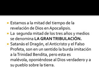 Este documento resume los capítulos 12 y 13 del libro de Apocalipsis. Describe la persecución de Satanás contra Israel y la iglesia, y la protección divina a Israel durante la Gran Tribulación. Luego presenta a la Bestia como un poder político que gobernará la Tierra y perseguirá a los creyentes, así como al Falso Profeta que lo apoyará con señales falsas.
