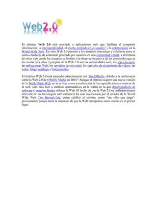 El documento define el término Web 2.0 como aplicaciones web que facilitan el compartir información y la colaboración entre usuarios generadores de contenido. Algunos ejemplos son comunidades web, redes sociales, wikis y blogs. Aunque el término sugiere una nueva versión de la web, realmente se refiere a cambios en cómo los desarrolladores y usuarios usan la web, no a actualizaciones técnicas. El creador de la web, Tim Berners-Lee, cuestionó que la Web 2.0 sea realmente diferente de las