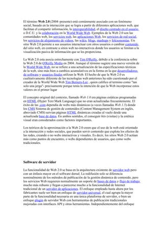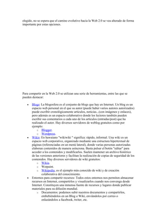 La Web 2.0 se refiere a sitios web que facilitan la interacción y colaboración entre usuarios a través de comunidades en línea, redes sociales, wikis y blogs. Estos sitios permiten a los usuarios crear y modificar contenido en comparación con sitios web tradicionales de solo lectura. Aunque el término sugiere una nueva versión de Internet, realmente se refiere a cambios en cómo los desarrolladores y usuarios utilizan la web de forma interactiva y centrada en el usuario.