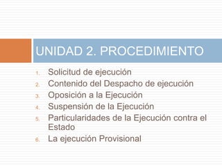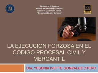 Este documento resume los aspectos fundamentales del procedimiento de ejecución forzosa en el Código Procesal Civil y Mercantil de El Salvador. Explica los pasos del proceso como la solicitud de ejecución, el contenido del despacho de ejecución, las posibles oposiciones a la ejecución, la suspensión de la ejecución, y las particularidades de la ejecución contra el Estado.