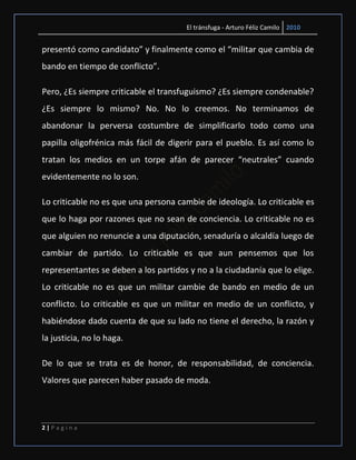 Este documento discute el concepto de "tránsfuga" y argumenta que no siempre es criticable cambiar de ideología o bando. Define al tránsfuga como alguien que cambia de ideología o colectividad, pero sostiene que solo es criticable hacerlo por razones que no sean de conciencia o por dinero u otros beneficios personales. Señala que defender principios como el honor, la razón o la justicia a pesar de la opinión dominante no es traición, sino un acto de patriotismo.