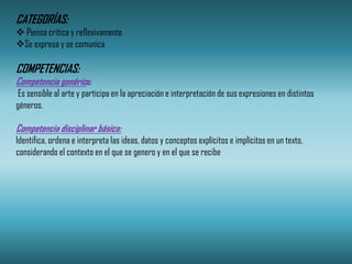Este documento presenta categorías y competencias relacionadas con el pensamiento crítico y la expresión y comunicación. Incluye una lista de emociones y sentimientos asociados con una novela que trata sobre una tragedia de amor y las contradicciones que plantea. También resume brevemente la biografía del autor argentino de la novela.