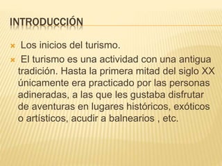 El turismo se ha desarrollado gracias a varios factores como la semana laboral de 5 días, las pensiones que permiten más tiempo libre y gasto, y la mejora en los medios de transporte como los coches y aviones. Los flujos turísticos se dirigen principalmente a núcleos receptores cercanos, intermedios o lejanos dependiendo de la distancia al centro emisor, con países como Francia, España y EE.UU. recibiendo una gran parte de los turistas a nivel mundial.