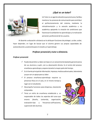 El tutor es un agente educativo que facilita la comunicación y el aprendizaje, concentrándose en las necesidades del alumno y fomentando su autonomía. A diferencia del profesor presencial, el tutor en educación a distancia debe tener un conocimiento profundo de sus estudiantes y desempeñar múltiples roles, proporcionando apoyo y orientación. Las funciones del tutor incluyen crear un ambiente de confianza, evaluar el aprendizaje, y promover el pensamiento crítico y la participación académica.