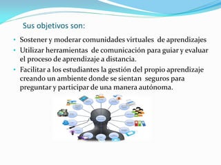 El documento describe las funciones y objetivos de un tutor de aprendizaje virtual. Un tutor busca sostener comunidades virtuales de aprendizaje, guiar el proceso de aprendizaje a distancia utilizando herramientas de comunicación, y crear un ambiente donde los estudiantes puedan aprender de manera autónoma y participar sin temor. Un tutor también debe capacitarse en dominar la disciplina, conocer los materiales didácticos, y comunicarse de manera cordial y comprometida.