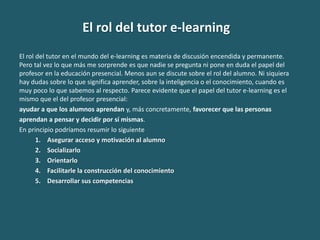 El documento describe el rol del tutor en entornos de aprendizaje en línea (e-learning). Explica que el papel del tutor es similar al del profesor en entornos de aprendizaje presencial, que es ayudar a los estudiantes a aprender y favorecer que aprendan a pensar y decidir por sí mismos. También resume algunas de las características y funciones clave de un tutor en línea, como dominar los contenidos del curso, poseer habilidades docentes, comprometerse con la tarea y dominar las herramientas