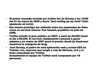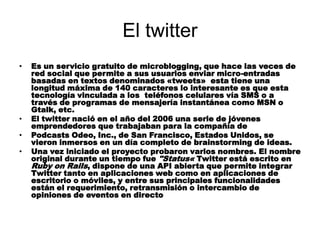 Twitter es un servicio gratuito de microblogging lanzado en 2006 que permite a los usuarios enviar "tweets" de hasta 140 caracteres a través de teléfonos celulares, computadoras u otras aplicaciones. Rápidamente ganó popularidad y ahora es una de las plataformas de comunicación más utilizadas a nivel mundial, tanto para interacciones sociales como profesionales. Recientemente, Twitter comenzó a permitir que los usuarios compartan imágenes directamente a través de la plataforma.