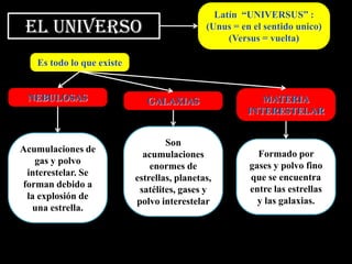 El universo está formado por nebulosas, galaxias y materia interestelar. Las nebulosas son acumulaciones de gas y polvo que forman nuevas estrellas, mientras que las galaxias son enormes acumulaciones de estrellas, planetas, gases y polvo interestelar. La Vía Láctea es una galaxia espiral en la que se encuentra nuestro sistema solar, compuesta por aproximadamente 100 mil millones de estrellas.