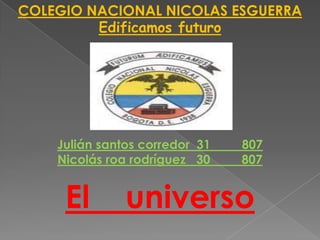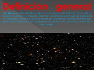 Este documento resume conceptos fundamentales sobre el universo. Explica que el universo está en constante expansión desde el Big Bang y está compuesto de galaxias, incluyendo la Vía Láctea, las cuales contienen estrellas, planetas, asteroides y cometas. Describe las diferentes formas de galaxias y detalla características de la Vía Láctea, las estrellas y otros cuerpos celestes dentro del universo.