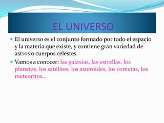 El documento resume los principales objetos del universo como galaxias, estrellas, planetas, el sol y la luna. Explica que las galaxias contienen estrellas y otros astros, las estrellas emiten luz y calor, y los planetas giran alrededor de una estrella. Describe los planetas interiores como Mercurio, Venus, Tierra y Marte, y los planetas exteriores como Júpiter, Saturno, Urano y Neptuno. Finalmente, menciona los eclipses y la Luna.