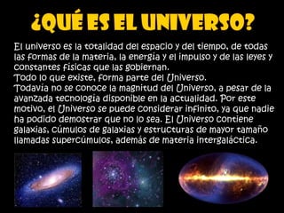 El documento describe el universo y sus componentes principales. Explica que el universo contiene galaxias, cúmulos de galaxias y supercúmulos, y que una galaxia es un conjunto de estrellas, gas y polvo cósmico unido gravitacionalmente. También describe las cuatro clasificaciones principales de galaxias (espirales, elípticas, lenticulares e irregulares) y dos teorías sobre cómo se formaron las galaxias.