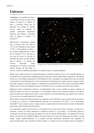1) El documento describe el universo, incluyendo su edad de 13,73 mil millones de años, su expansión desde el Big Bang, y la teoría de que se originó a partir de una singularidad de densidad infinita. 2) Explica que la expansión del espacio permite que objetos se separen a velocidades mayores que la luz y describe la evolución del universo desde una sopa primordial de partículas hasta la formación de galaxias. 3) Discuten teorías sobre el posible destino final del universo, como el Big Crunch, Big Rip