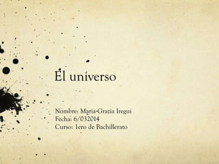 El documento resume lo que es el universo, incluyendo que tiene entre 13.730 y 13.810 millones de años, que contiene aproximadamente 93.000 millones de años luz, y que su inicio se conoce como el Big Bang. También menciona los planetas de nuestro sistema solar, siendo Mercurio, Venus, Tierra, Marte, Júpiter, Saturno, Urano y Neptuno.