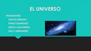El documento proporciona información sobre el universo, incluyendo que está compuesto de galaxias, estrellas, planetas y otros objetos celestes. Describe los diferentes tipos de estrellas, galaxias, planetas de nuestro sistema solar, constelaciones y conceptos como agujeros negros, la Gran Explosión y la astronomía. También explica brevemente el Cinturón de Kuiper y la Nube de Oort.
