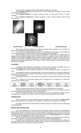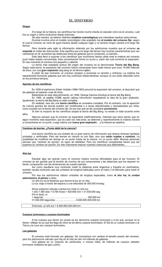 1) El documento describe el origen y evolución del universo según la teoría del Big Bang, la cual propone que hace aproximadamente 15,000 millones de años el universo comenzó con una gran explosión y desde entonces ha estado expandiéndose.