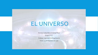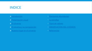 El documento resume los principales aspectos del universo. Explica que el universo lo componen galaxias, cúmulos de galaxias y materia interestelar distribuida de forma no uniforme. Además, señala que nuestro planeta es minúsculo en comparación con el vasto universo y forma parte de la Vía Láctea, una galaxia compuesta por cientos de miles de millones de estrellas. Por último, detalla que desde la antigüedad los humanos han observado el cielo para estudiar los astros y agrup