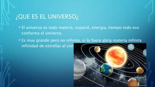 El universo contiene toda la materia, energía, espacio y tiempo. Se originó a partir de un gran estallido conocido como Big Bang, en el que toda la materia emergió de un punto de densidad infinita. La Vía Láctea, donde se encuentra nuestro sistema solar y por lo tanto la Tierra, es una de las muchas galaxias en espiral que contienen planetas, estrellas y gas interestelar. El Sol es una estrella de tamaño mediano ubicada en un brazo espiral de la Vía Láctea.