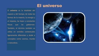 El universo es la totalidad del espacio y tiempo, con una edad estimada de 13.73 mil millones de años y en expansión desde el Big Bang. Las galaxias, que pueden ser elípticas, espirales o irregulares, son conjuntos de materia interconectados gravitacionalmente, y algunas, como los cuásares, son altamente activas y emiten gran cantidad de energía. Este documento destaca la importancia del estudio del universo y la curiosidad sobre lo que existe más allá de nuestra galaxia.