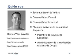 El documento examina la integración de JavaScript en Drupal 7, detallando el uso del objeto js y bibliotecas como jQuery. Se enfatiza la importancia de buenas prácticas en el desarrollo y cómo añadir scripts eficientemente, así como el uso de características del Form API y AJAX. Se concluye que, a pesar de las mejoras, el mal uso de JS puede afectar el rendimiento del cliente.