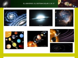 El documento resume los principales elementos del universo y el sistema solar. Explica que el universo se originó a partir de una gran explosión hace unos 15.000 millones de años y que está formado por galaxias, entre ellas la Vía Láctea donde se encuentra el sistema solar. Este último está formado por el Sol y planetas, así como satélites, asteroides, cometas y meteoritos que orbitan alrededor del Sol debido a su gravedad.
