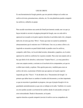 El documento explica el uso de Google Drive, una herramienta gratuita que permite trabajar en la nube con archivos de texto, presentaciones y hojas de cálculo. Se detalla cómo crear, compartir y organizar archivos en Drive, así como la gestión del almacenamiento y el acceso a un historial de cambios. También se menciona la posibilidad de subir archivos desde el ordenador y recuperar documentos eliminados.