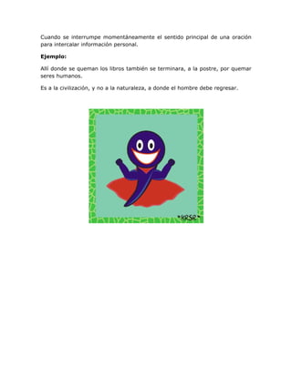 Este documento describe los dos tipos principales de comas y sus funciones. Las comas que van solas se utilizan para separar elementos como oraciones principales, conjunciones como "pero", y cláusulas introductorias. Las comas que funcionan por pareja se colocan antes y después de elementos que interrumpen temporalmente el sentido principal de una oración, como información adicional.