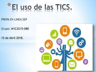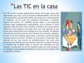 El documento describe algunas de las aplicaciones más importantes de las tecnologías de la información y la comunicación (TIC) en el hogar, la educación y el ámbito laboral. En el hogar, el teléfono y la televisión son dos de los dispositivos más utilizados que permiten la comunicación y el entretenimiento. Las TIC en educación facilitan el desarrollo de competencias y el acceso a la información para los estudiantes. En el ámbito laboral, las empresas pueden beneficiarse de las TIC a través de la promoción en redes
