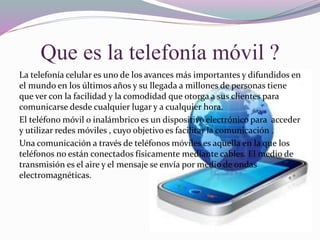 La telefonía móvil permite la comunicación sin cables mediante el uso de ondas electromagnéticas transmitidas a través del aire. Está formada por una red de antenas que comparten la señal y teléfonos móviles que pueden acceder a la red desde cualquier lugar. Las antenas y teléfonos funcionan como emisores y receptores de ondas de frecuencia entre 900-2000 MHz. La red está dividida en celdas hexagonales para cubrir todo el territorio.