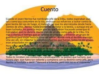 El joven Nerino es nombrado jefe de la tribu y se espera que luche contra la gran bestia del volcán que los ha aterrorizado, pero en lugar de eso cambia el asentamiento cuando la bestia ataca y deja pasar los años. Cuando es anciano, prepara guerreros durante una nevada invernal para enfrentar a la débil bestia, revelando que había estado esperando el frío para debilitarla. Su paciencia le permitió derrotar a la bestia sin luchar.