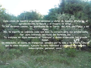 Este documento describe una experiencia espiritual en la naturaleza. La persona se entrega a la naturaleza y es aceptada y guiada por diferentes guardianes y espíritus. Experimenta una conexión profunda con la tierra, los elementos y su propio ser, en un estado de paz, equilibrio y expansión espiritual.