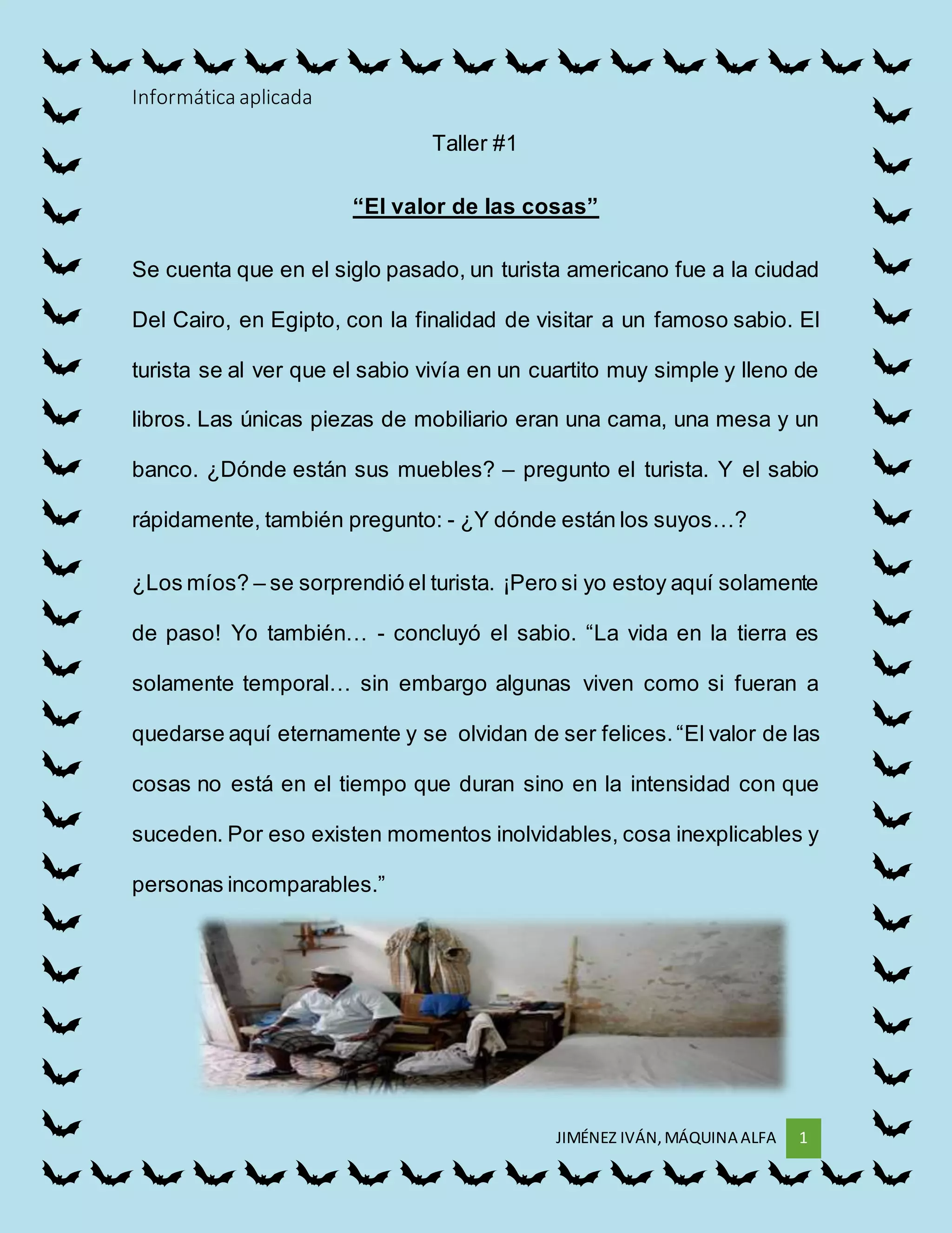 Un turista americano visitó al sabio de El Cairo y se sorprendió de que viviera en un cuarto simple con solo una cama, mesa y banco. El sabio preguntó dónde estaban los muebles del turista, quien dijo que solo estaba de paso. El sabio concluyó que la vida en la tierra es temporal y que algunos viven como si fueran a quedarse para siempre, olvidando ser felices. El valor está en la intensidad de los momentos, no en su duración.