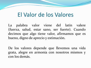 El documento clasifica y describe diferentes tipos de valores. Define la personalidad como la expresión máxima de lo que una persona es y hace. Explica que la ética estudia la bondad y maldad de los actos humanos. Finalmente, clasifica los valores en seis categorías: biológicos, sensibles, económicos, estéticos, intelectuales y religiosos.