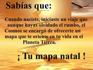 El documento habla sobre el mapa natal como una guía para entenderse a uno mismo y conectarse con el universo. Explica que el mapa natal muestra las energías que definen nuestra personalidad y cómo podemos usarlo para descubrir nuestro verdadero ser interior y propósito. También discute conceptos como vivir en el presente, la teoría de los agujeros negros, y cómo cada experiencia en la vida es una oportunidad para crecer espiritualmente.