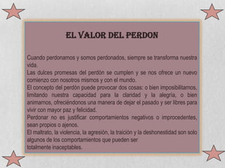 El documento habla sobre el valor del perdón. Explica que cuando perdonamos y somos perdonados, nuestra vida se transforma y se nos ofrece un nuevo comienzo. El perdón puede animarnos u obstaculizarnos. Perdonar no justifica comportamientos negativos, aunque el perdón verdadero implica reconocer los errores y buscar reparar el daño causado.