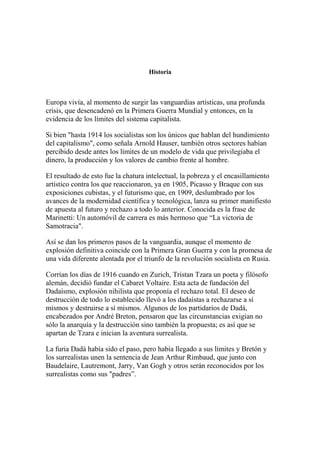 El documento describe los principales movimientos de vanguardia que surgieron en Europa y América en las primeras décadas del siglo XX como respuesta a la crisis de valores de la época. Entre ellos se encuentran el creacionismo, el ultraísmo y el surrealismo en América, y el expresionismo, cubismo, futurismo, dadaísmo y surrealismo en Europa, cada uno con características innovadoras en el lenguaje, los temas y la actitud hacia la realidad.