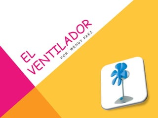 Este documento describe el ventilador, incluyendo su concepto, función, tipos y su inventor. Explica que un ventilador es una máquina que produce una corriente de aire usando aspas giratorias y que fue inventado por Schuyler S. Wheeler en 1882. Luego detalla los usos principales de ventilación y circulación de aire, y los tipos como industriales, de pared, de mesa y de piso.