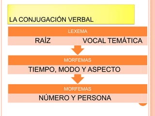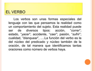 El documento describe las categorías verbales y sus características. Explica que los verbos expresan acciones, estados o cualidades del sujeto y que su función es ser el núcleo de la oración. Luego detalla las categorías de tiempo, modo, aspecto, número y persona de los verbos y cómo estas afectan su conjugación y uso en las oraciones.