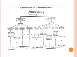 El documento describe los aspectos morfológicos, sintácticos y semánticos del verbo. Explica que el verbo está constituido por un lexema y morfemas flexivos que aportan información sobre la persona, número, tiempo, modo, aspecto y voz. También describe los diferentes tipos de verbos, la conjugación, las perífrasis verbales y las formas no personales del verbo.