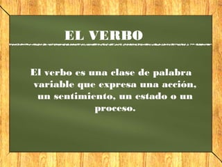 Este documento habla sobre los verbos en español. Explica que el verbo expresa una acción, sentimiento o estado y se compone de una raíz y desinencia. Describe los accidentes morfológicos del verbo como la persona, número, tiempo y modo. También cubre temas como la conjugación, verbos regulares e irregulares, tiempos simples y compuestos, y formas no personales del verbo.